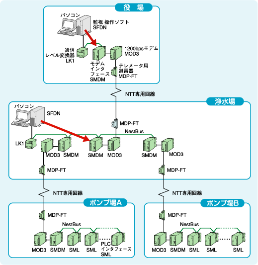 テレメータシステムですので、浄水場と役場にモデムインタフェース(形式:SMDM)があると思います。 役場(親局)の方はSMDMを監視します。浄水場(子局)で役場(親局)に対応しているSMDMの「Ai:受信端子」、「Di:受信端子」の再発信(Item19)の設定は、通常は、0のしないにしていますが、1のありに変更します。これにより「Ai:受信端子」、「Di:受信端子」はそれぞれ「Ai:送受信端子」、「Di:送受信端子」となり、送信端子の機能(データをNestBusへ放送する機能)をもつことになります。 このSMDMの機器間伝送端子をSFDNで見ることにより、1つのプロジェクトで監視できます。 ただし、子局と親局のSMDMカード番号が同一であり、子局側の送るための受信端子と親局側の受けとるための送信端子のグループ番号が同一でなければなりません。