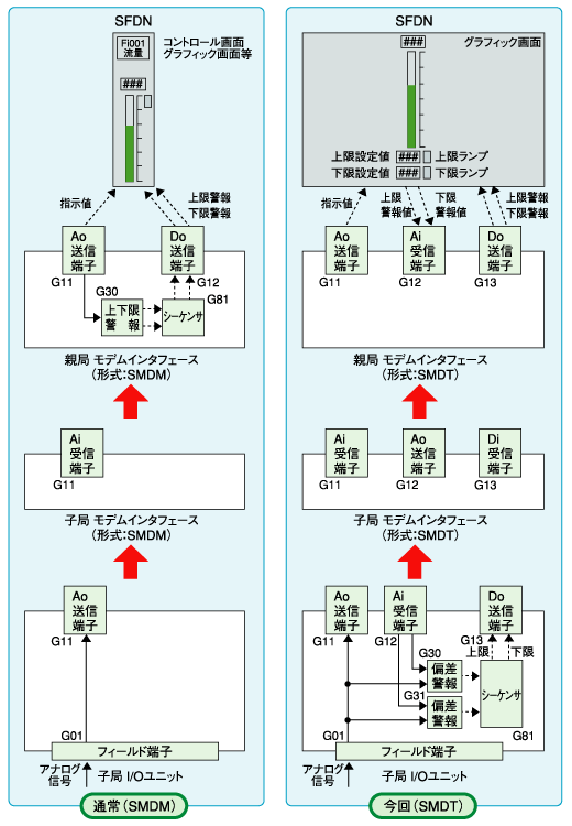 モデムインタフェース(形式:SMDT)にはご存じのとおり演算ブロックがなく、上下限警報がありません。 そのため、SFDNの計器で指示警報計を作ることができません。 しかし、下記の方法で同様の機能が実現できます。 グラフィック画面で、アナログの指示計、上限警報と下限警報のランプ、上限警報設定値と下限警報設定値を作ります。タグもそれぞれ作成します。 テレメータ回線を使って、パソコンから現場のI/O機器まで、上限警報設定値と下限警報設定値を送ります。 その機器内の演算ブロックの2つの偏差警報(上限警報用、下限警報)を使うと、同じ機能が実現できます。