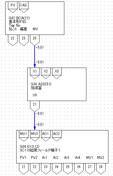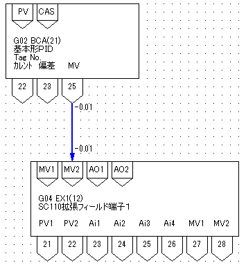 ■ バランスレス復帰モード バックアップユニットからの出力を本体からの出力に復帰するとき、バックアップ出力のMVに本体のMVが追従して自動でトラッキングします(バランスレス)。 これは、図1のアナログ接続端子画面のように、調節計ブロックの MV とフィールド端子のMV2が直接接続されていることが条件です。 もし、直接接続されていない場合は、バランス復帰モードをご使用ください。