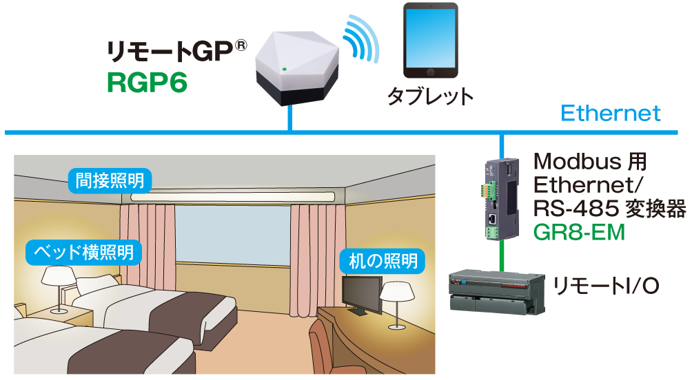 ホテル客室の照明の操作を、RGP6とリモートI/Oを組合せたシステムを使用することで、タブレット画面から行うことができます。RGP6の画面はブラウザソフトで表示しますので、タブレットに専用アプリは不要、設置後すぐに利用できます。