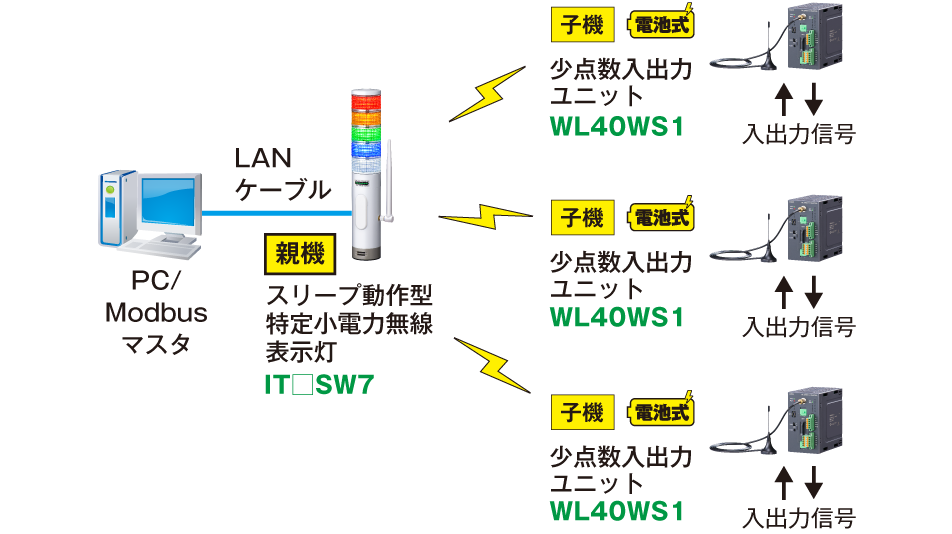 | Modbus/TCP (Ethernet)、 スリープ動作型 特定小電力無線 表示灯 |