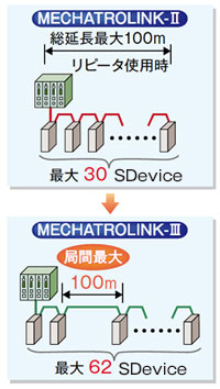 (2)最大接続Subordinate Device数を62局に増強! 局間ケーブルは最大で100mに延長!(図2)