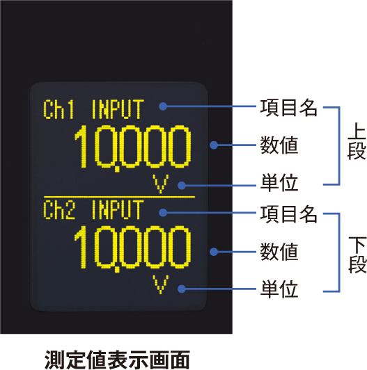 上段、下段にチャネル1、チャネル2の入力実量値、入力スケーリング値、パーセント値、出力実量値をご使用環境に合わせて自由に選択することができます。