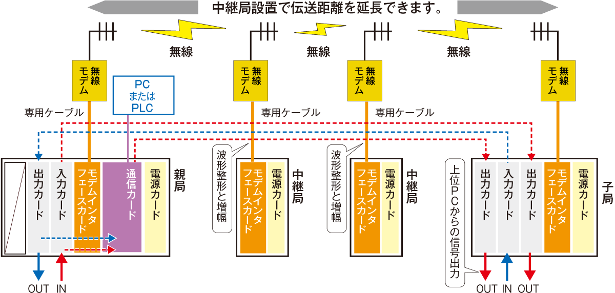 上位PCでロギングしたり子局へPCからの制御信号を出力することもできます。親局に入力・出力カードを設置せず、PCまたはPLCだけでロギングを行う構成にもできます。