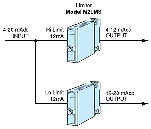 with 4 to 12 mAdc, while B is operated with 12 to 20 mAdc. To solve this problem, you can use two Limiters model M2LMSs. Set high limit to 12 mA, 50% of full-scale for Valve A and low limit to the same value for B. However the control signal changes below 12 mA, a constant 12 mA signal is provided to Valve B, and over 12 mA, it is provided to Valve A. |