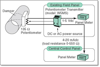 like to recommend our potentiometer transmitter, the W5MS.The W5MS is super-mini sized terminal block shaped transmitter which provides two (2) isolated DC output proportional to a potentiometer input. Therefore this is the available unit especially when you have to install instruments in limited space of existing panel. Just for your information, when you select 4-20 mA for both output 1 & 2, the each output can be used to 550 ohms as load resistance. |