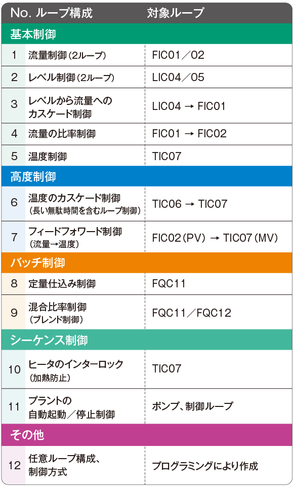 プラントレットでは、シングルループコントローラを中心とする諸々の計装機器によって、各種の制御ループが構成されています。表に主な制御内容(ループ構成)と対象ループの一覧を示します。